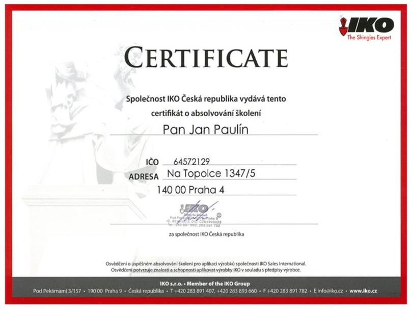 Naši kvalifikaci k odbornému provádění prací garantuje Cech klempířů, pokrývačů a tesařů, který dbá na odbornost a profesionalitu svých členů. Míra a kvalita bezpečnosti provádění prací je garantována členstvím v profesním sdružení instruktorů horolezecké techniky a pravidelným prováděním školení BOZP. V neposlední řadě je naše kvalita zřejmá ze značných referencí a působením na stavebním trhu od roku 1992.